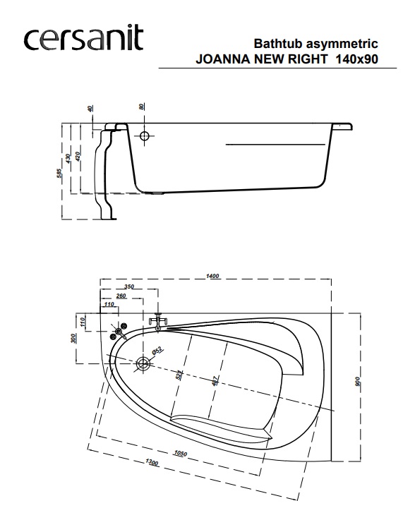 Cersanit Joanna aszimmetrikus akril kád 140x90 cm jobbos kivitelben KÉSZLETSÖPRÉS