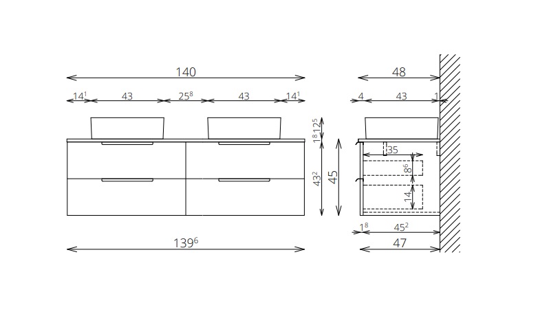 Tboss Nola 140 4F 2M alsó fürdőszobabútor 4 fiókkal, 2 kerámia mosdóval, 3 féle fogantyúval és 19 színben választható