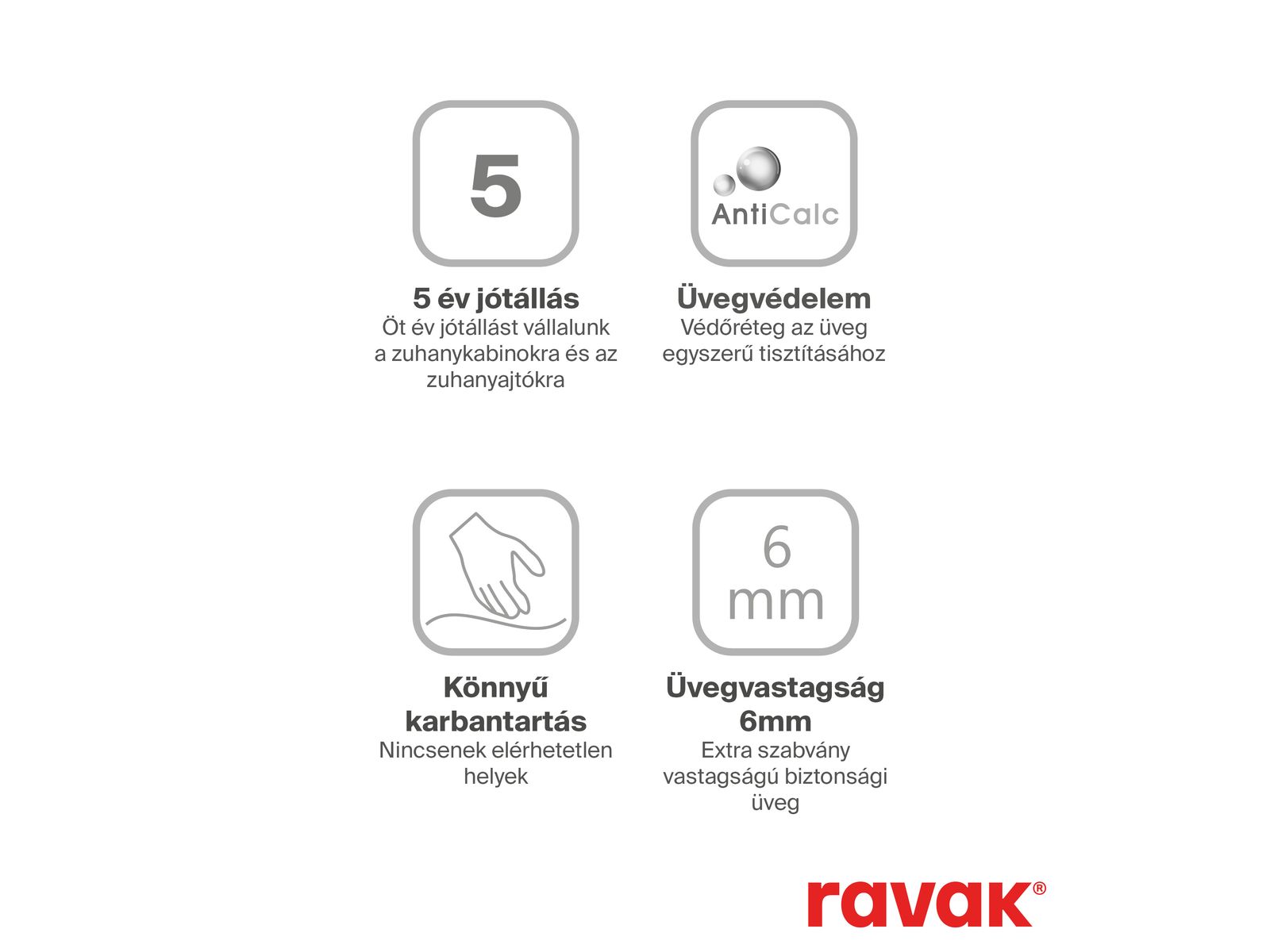 - biztonsági üvegből készült betét: 6 mm; Transparent Ravak AntiCalc® üvegvédelemmel